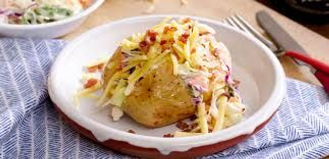 Indulge in the ultimate comfort food with our savory cheese and bacon jacket potato, completed with a refreshing side salad. Our potatoes are oven-baked to perfection, featuring a crispy skin and fluffy interior, and generously stuffed with melted cheddar cheese and crispy bacon. The salad adds a light and fresh contrast to the rich and satisfying flavors of the potato. Perfect for a quick and satisfying lunch , our cheese and bacon jacket potato will satisfy your cravings and keep you coming back for more. Served with salad and coleslaw. Order now and experience the ultimate combination of comfort and flavor!
